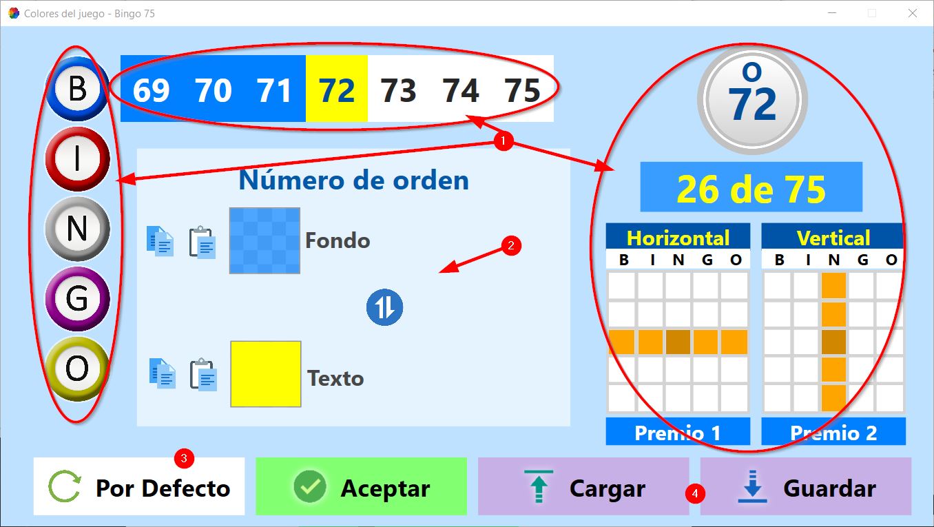 - Abre un formulario para cambiar los colores y transparencias de algunas partes de la pantalla del juego para el bingo seleccionado (ver siguiente imagen).