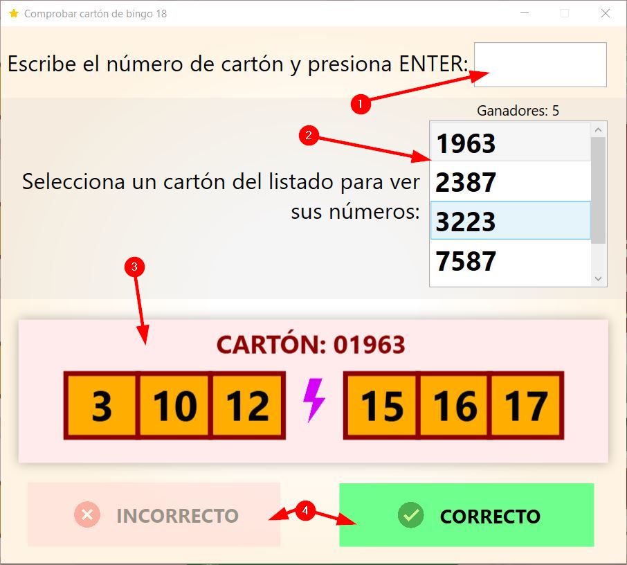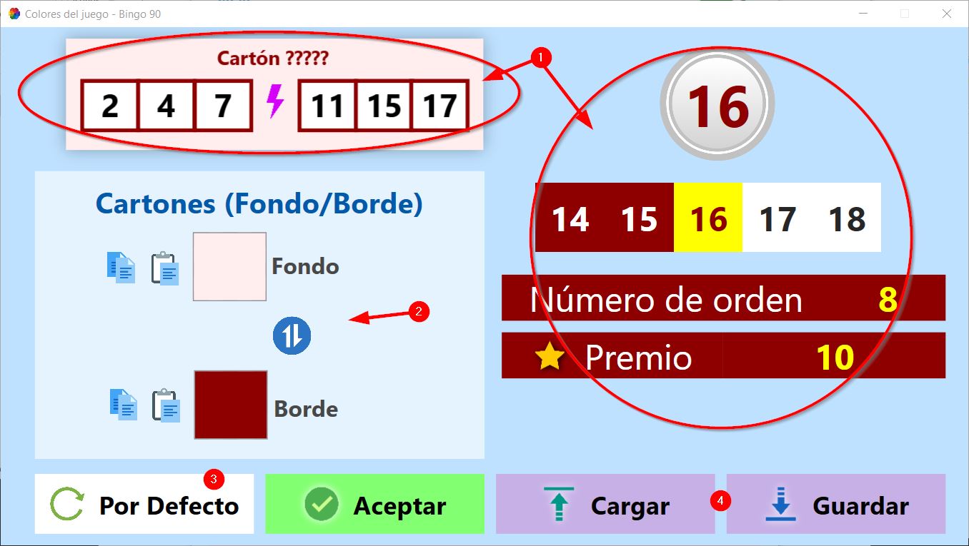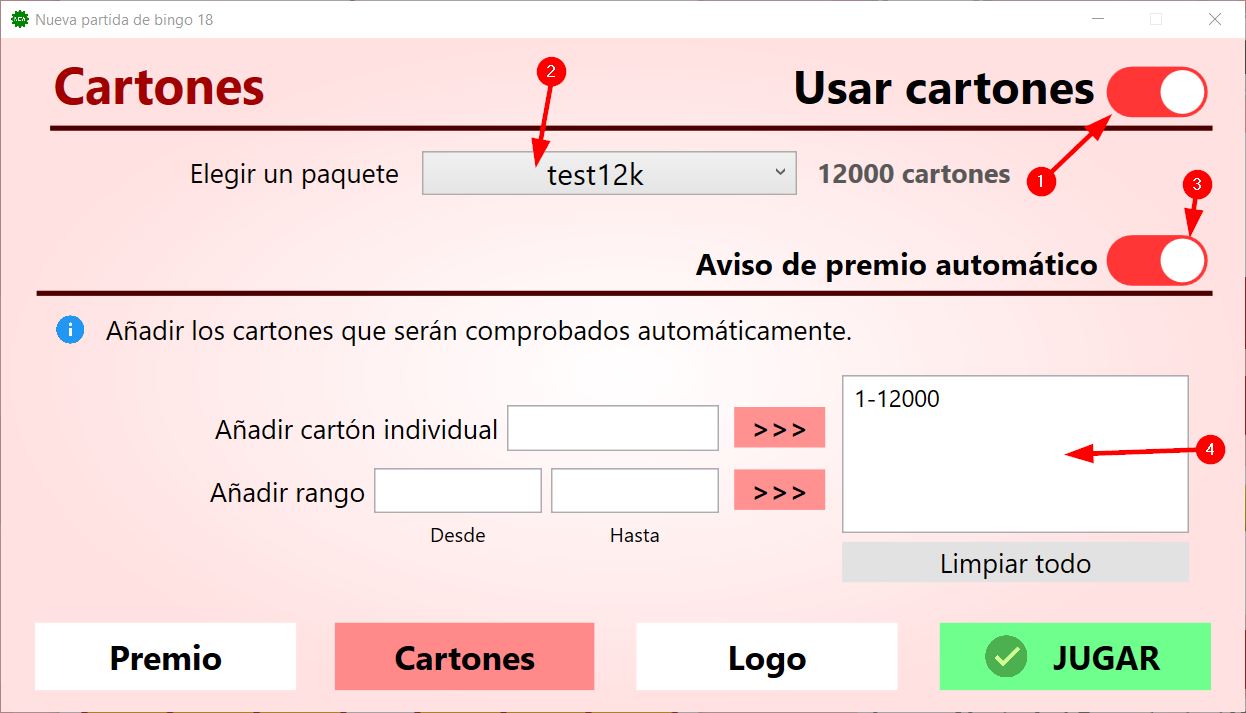 La activación de (4) es para que durante la partida se muestre un aviso automático cuando alguno de los cartones de bingo que hemos establecido consiga un premio.