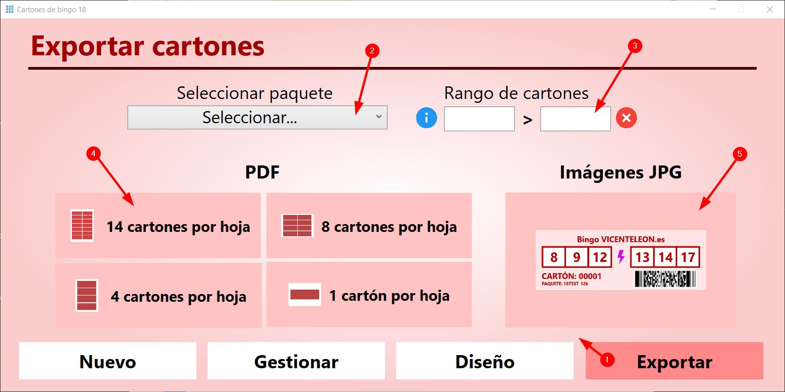 - Aquí podemos generar PDF con los cartones de bingo o guardarlos en formato de imagen JPG.