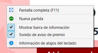 - Información de atajos de teclado: Muestra una ventana con información sobre los atajos de teclado dispònibles para usar durante el juego.