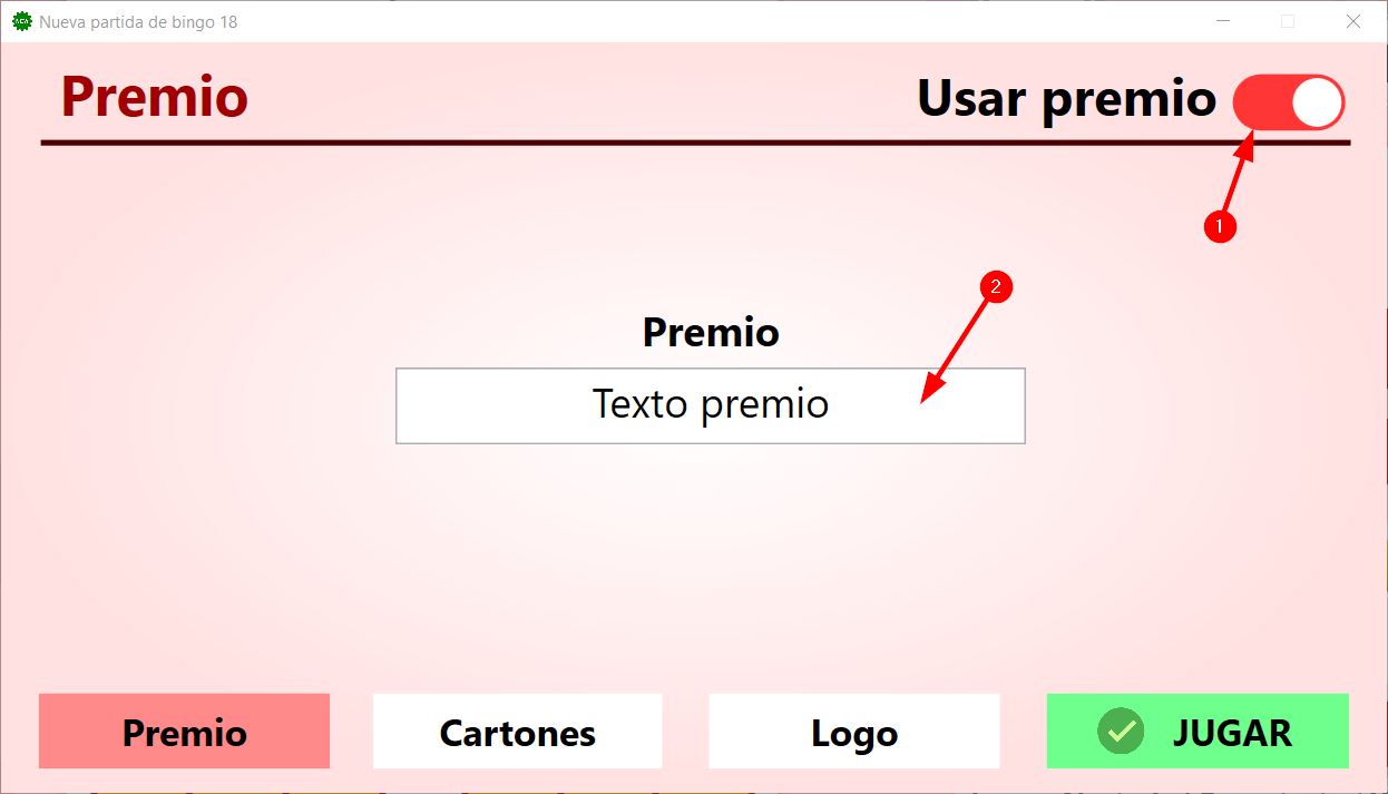 - Si lo desactivamos, no se usarán cartones durante la partida, es decir, al abrir el formulario de comprobación de premios, no podremos elegir ni escribir nada, solo hacer clic en si es correcto o no lo es.